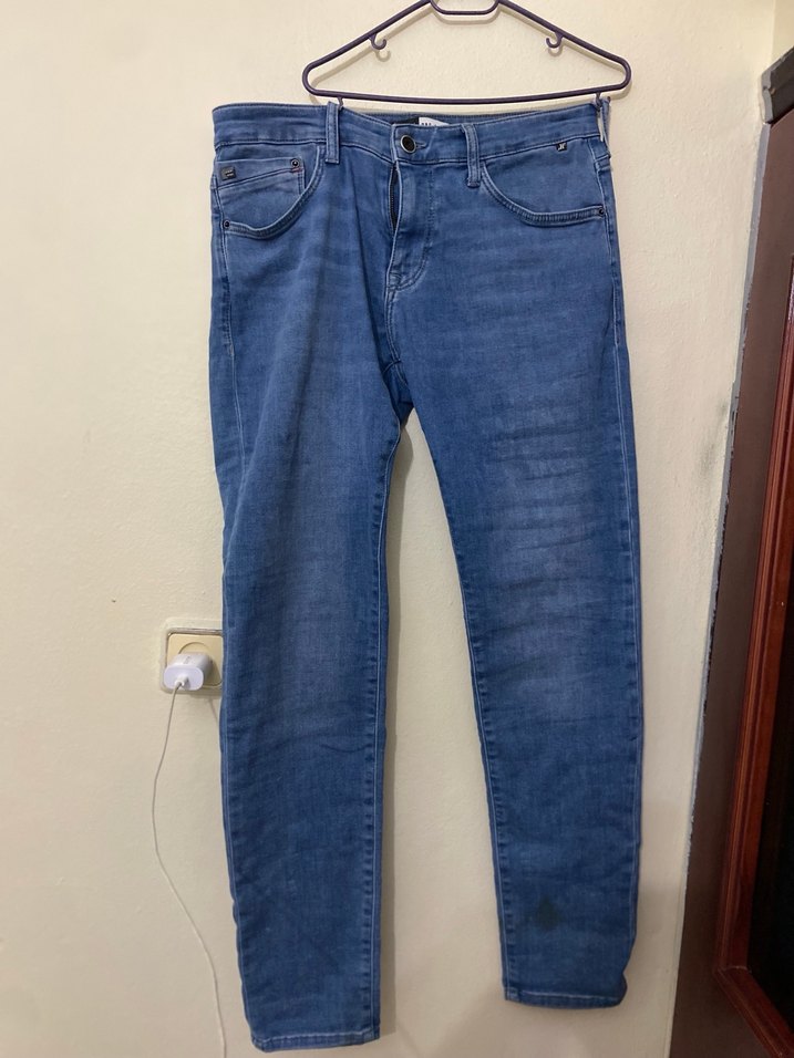 Gri renkte bol kesim erkek denim pantolon, tokalı detaylı, günlük kullanıma uygun rahat ve normcore tarzda.