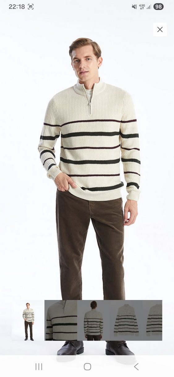 Bu erkek kazak, bisiklet yaka ve uzun kollu olup, normal boyda ve regular fit kesimdedir. Yünden örülmüş olup kahverengi taban üzerinde gri çizgilerle tasarlanmıştır.