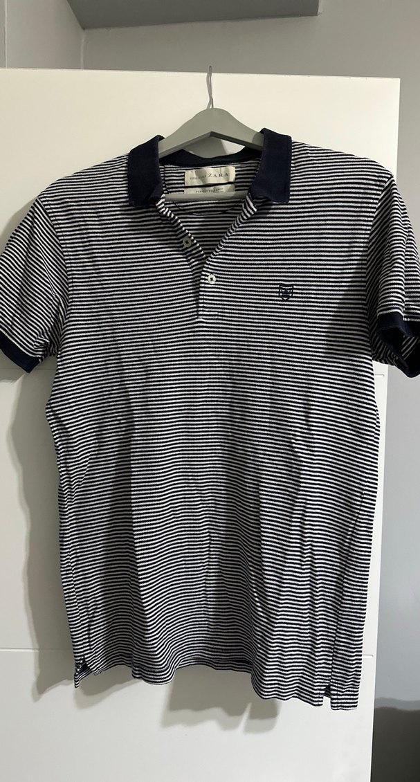 Bu erkek polo tişört kısa kollu, yakalı ve vücuda oturan kesime sahiptir. Pamuklu, koyu gri ve beyaz çizgili, düğmeli ve küçük nakışlı logo detaylıdır. Beden değişikliğinden dolayı satıyorum yakasında ütü buharından kaynaklı renk açılması mevcuttur belirgin değildir