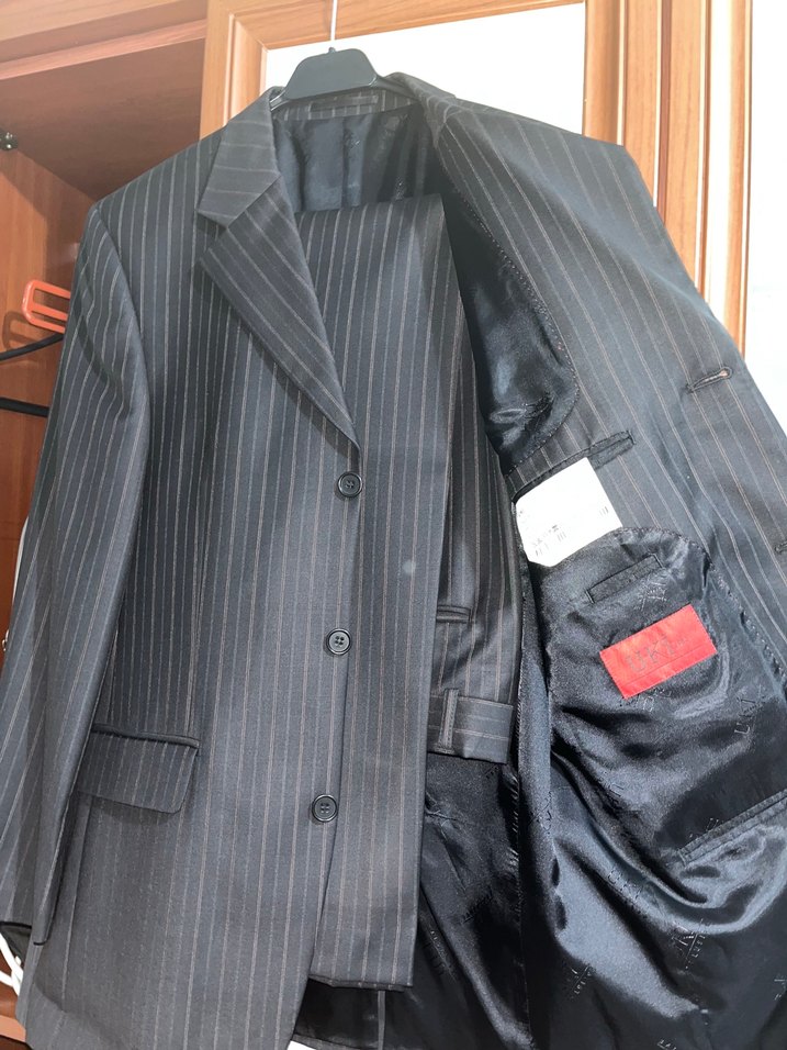 Gri çizgili, düğmeli ve regular fit erkek takım elbisesi. Uzun kollu, notched lapel yakalı ve normal uzunluktadır. Ofis kullanımı için uygundur.
