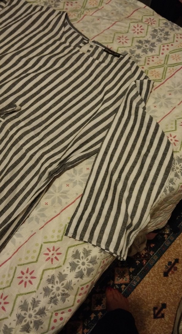 Gri çizgili, uzun kollu, düğmeli, tekne yaka, bol kesim Bohem ve vintage tarzda.