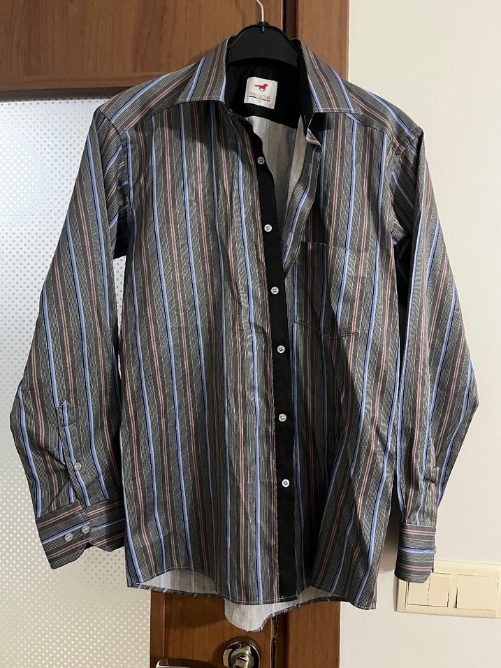 Erkekler için uzun kollu, düğmeli, yakalı ve çizgili desene sahip gri gömlek. Rahat kalıp ve sentetik kumaştan üretilmiştir. Günlük kullanım için uygundur.