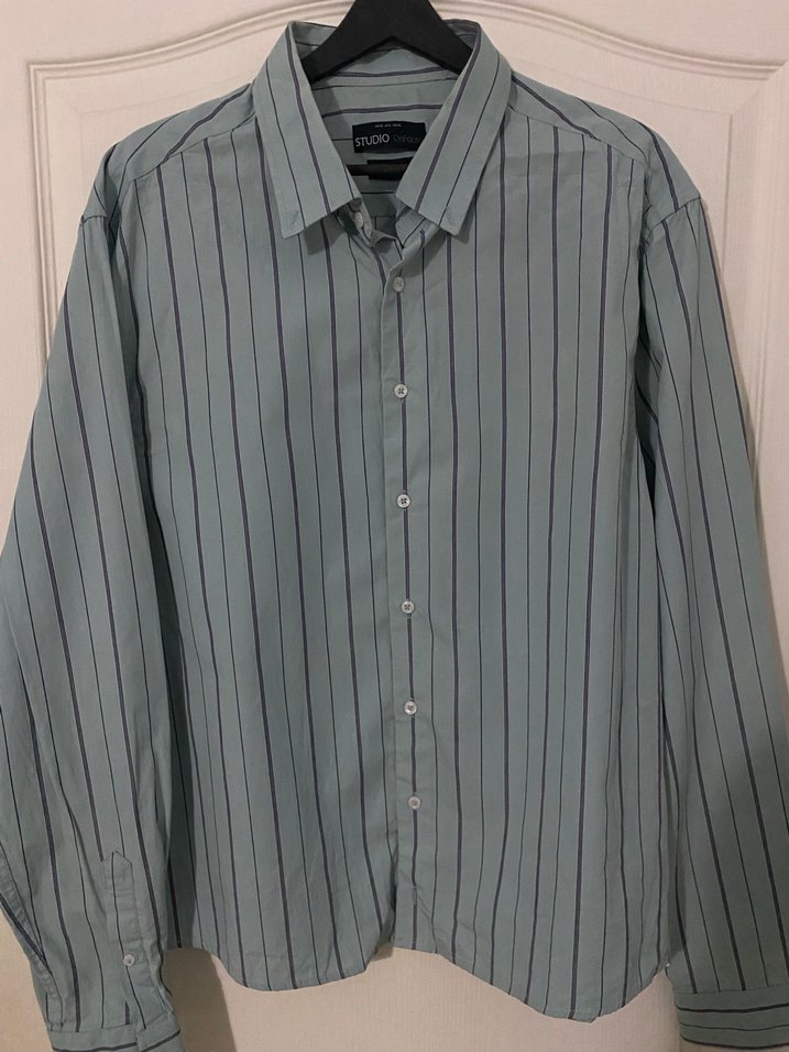 Düğmeli ve yakalı, gri çizgili uzun kollu erkek gömleği. Rahat kesimli ve sentetik kumaştan, günlük veya ofis kullanımı için uygun.