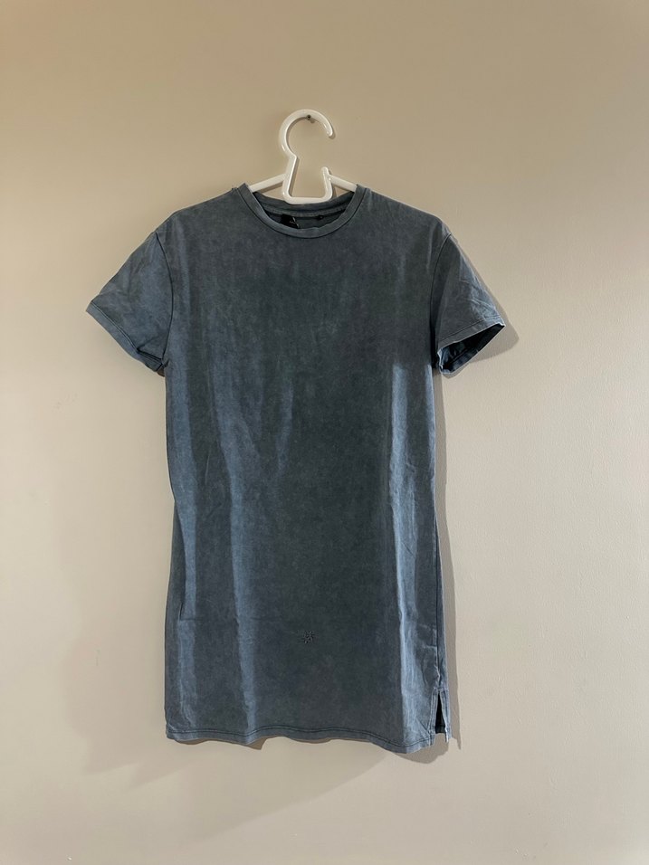 Gri denim kumaştan yapılmış, kısa kollu ve bisiklet yaka erkek tişörtü. Salaş kesimi ve bağlama desenli modeliyle günlük kullanıma uygundur.