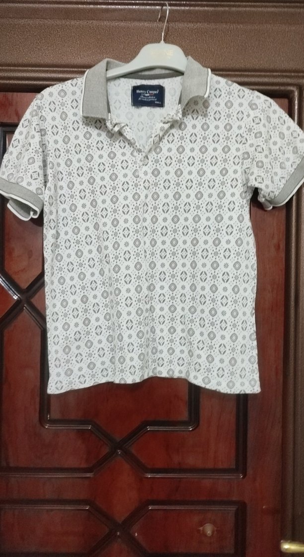 Pamuk kumaştan, bol kesim kısa kollu, yakalı erkek polo tişört. Beyaz zemin üzerinde gri desenler ve düğme detayları bulunur. Günlük ve sokak stiline uygun.