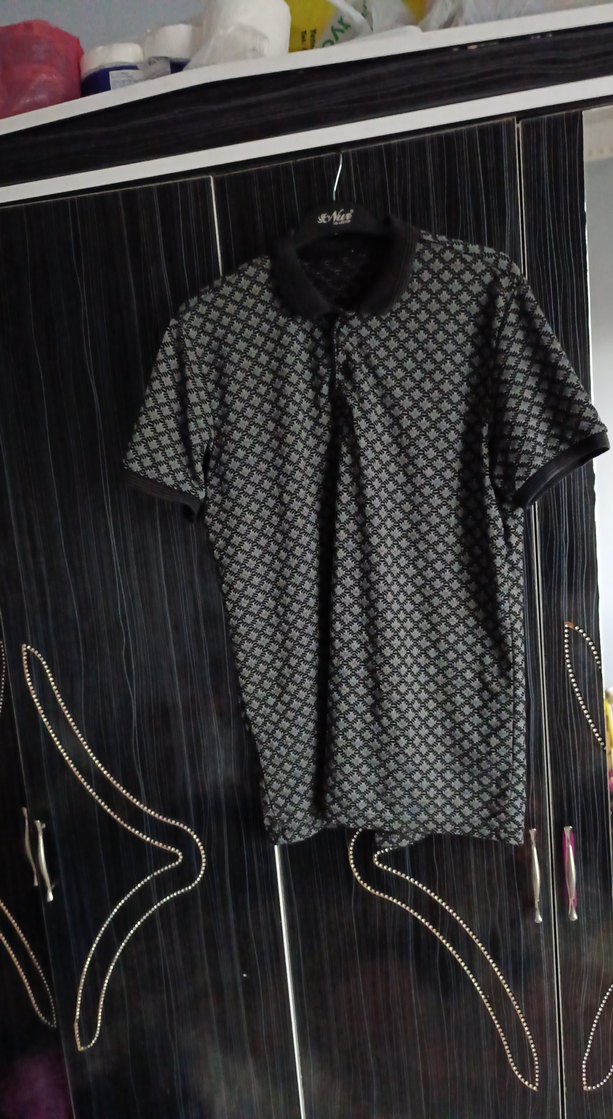 Gri, baskılı desenli, kısa kollu polo tişört. Düğmeli ve yakalı, bol kesim. Günlük rahat kullanım için sentetik kumaştan yapılmıştır.