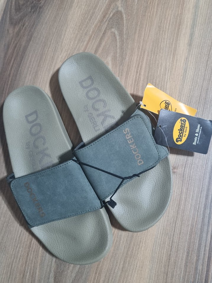 Gri renkte, tokalı kayışlı erkek terlik. Kauçuk malzemeden, baskılı ve günlük kullanım için rahat. Dockers marka, sokak stiline uygun.