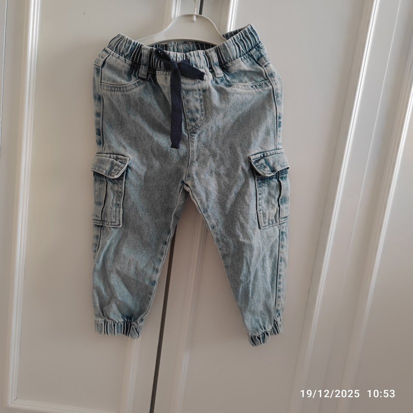 Gri renkli, bol kesim ve düğmeli detaylara sahip erkek çocuk denim pantolon. Rahatlık için lastikli bel ve paçalar içerir.