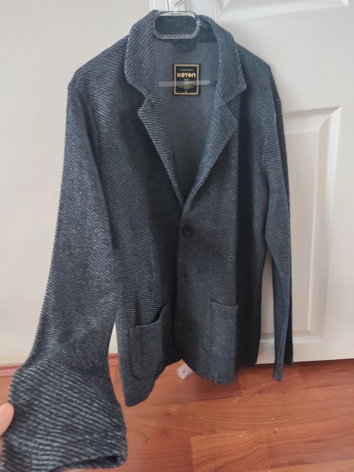 Erkek gri düğmeli ceket, notched lapel yakaya ve uzun kollara sahiptir. Normal kesim ve yumuşak, sıcak kumaştan üretilmiştir. Ofis ve iş ortamları için uygundur. l beden koton marka yepyeni