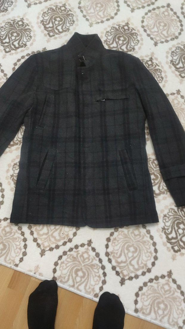 Erkek gri düğmeli ceket, sivri yakalı ve uzun kolludur. Normal kesim ve midi boyda, sentetik kumaştan üretilmiştir. Günlük sokak stili için uygundur.