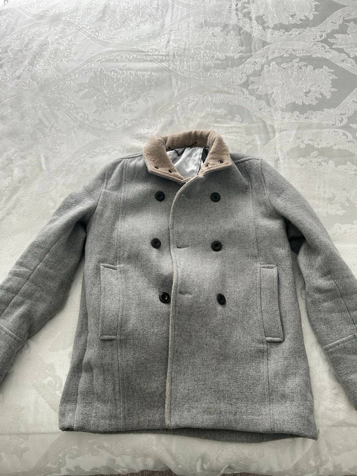 Erkek gri düğmeli midi kaban, yumuşak ve sıcak kumaştan, normal kesim ve uzun kollu, notalı yaka ile sokak tarzına uygun. M beden sorunsuz defacto marka