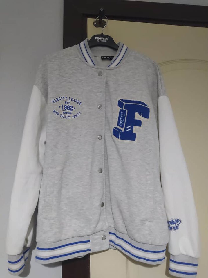 Erkek çocuklar için gri renkli, düğmeli, bol kesim, bisiklet yaka sweatshirt tarzı ceket. Beyaz kollu ve baskılı detaylara sahip. Rahat ve sıcak kumaştan.kolundaki ufak lekeyi belirttim görselden bakabilirsiniz