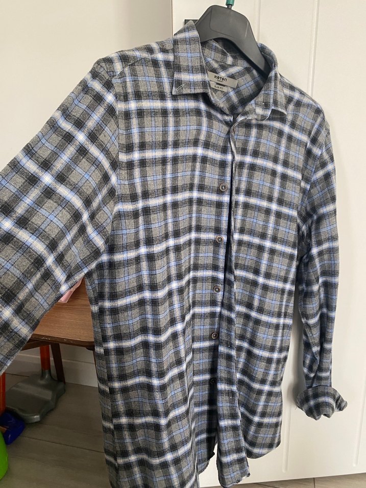 Erkekler için gri kareli keten gömlek, düğmeli, uzun kollu ve normal uzunlukta midi kesimdir. Rahat ve günlük kullanıma uygundur.