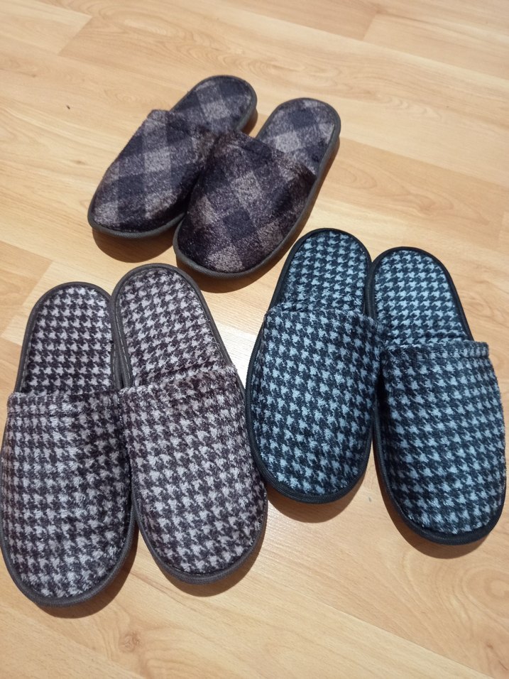 Örgü dokusuyla yapılmış erkek gri ekoseli ev terlikleri, rahat iç mekan kullanımı için yumuşak tabanlı klasik tasarım.