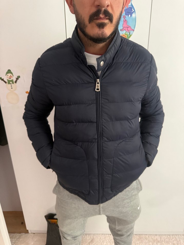 Erkekler için dik yakalı, fermuarlı, uzun kollu ve laci renkte yumuşak kumaştan yapılmış, günlük kullanıma uygun, normal midi uzunlukta sade mont.çok küçük bir kusuru var