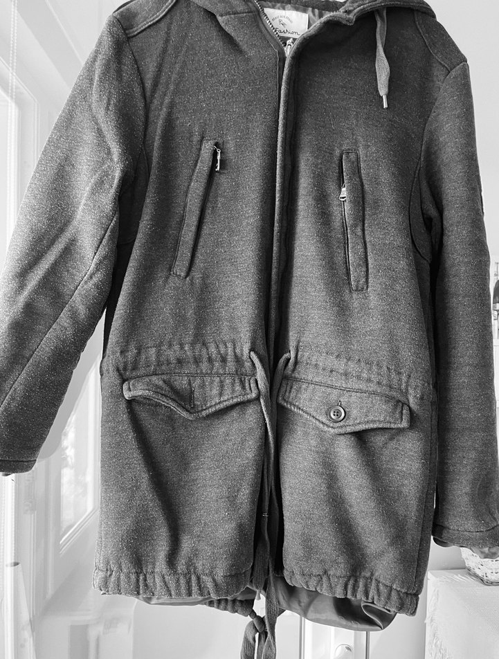 Gri renkli, fermuarlı ve cepli erkek kabanı. Notch yaka ve bol kesimiyle rahat, yumuşak kumaştan yapılmıştır.