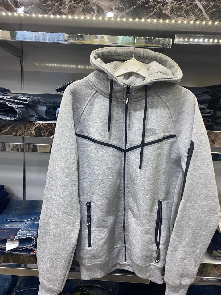 Gri renkte, fermuarlı ve kapüşonlu erkek sweatshirt. Yumuşak ve sıcak kumaştan, uzun kollu ve dar kesimdir. Günlük rahat kullanıma uygundur.