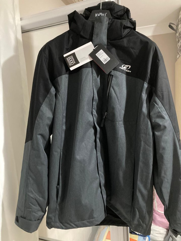Gri renkli, uzun kollu ve yüksek yakalı erkek kayak montu. Yumuşak polar kumaştan, fermuarlı ve baskılı desene sahip, dış mekan kullanımı için uygun. İçi çıkarılabilir su geçirmez
