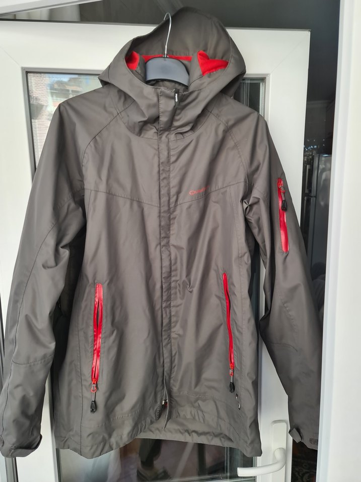 Gri renkli erkek yağmurluğu, fermuarlı cepler ve kırmızı detaylarla midi boyda, uzun kollu ve dar kesimdir. Sentetik kumaştan üretilmiştir.