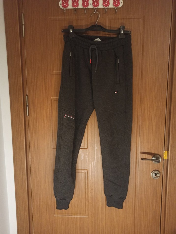 Erkekler için koyu gri, fermuarlı cepli ve rahat kesimli eşofman altı. Yumuşak ve sıcak kumaştan üretilmiştir, günlük rahat sokak stili için uygundur.
