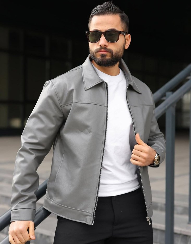 Erkek Gri Fermuarlı Suni Deri Ceket