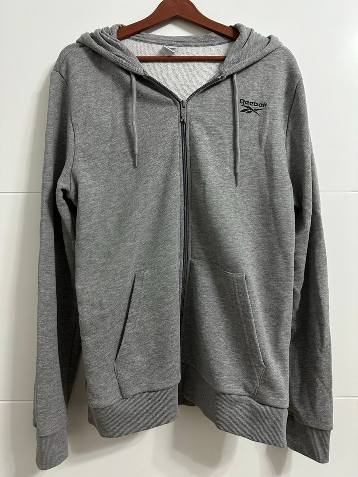 Erkek gri fermuarlı kapüşonlu sweatshirt, yuvarlak yaka ve uzun kolludur. Yumuşak kumaştan üretilmiş, bol kesim ve sade tasarıma sahiptir.