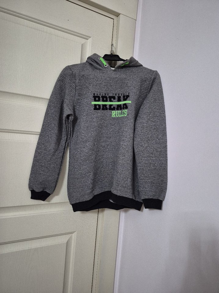 Erkek çocuklar için gri kapüşonlu sweatshirt, yuvarlak yakalı ve uzun kolludur. Örgü dokusu ve "RULS, DAGAA" baskılı desenlidir. Yumuşak, sıcak kumaştan üretilmiştir.