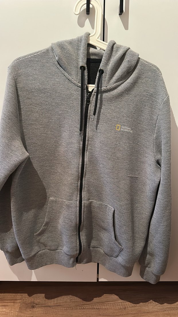 Erkekler için gri kapüşonlu fermuarlı sweatshirt, uzun kollu ve bol kesim. Yumuşak kumaştan günlük ve sokak stiline uygun.