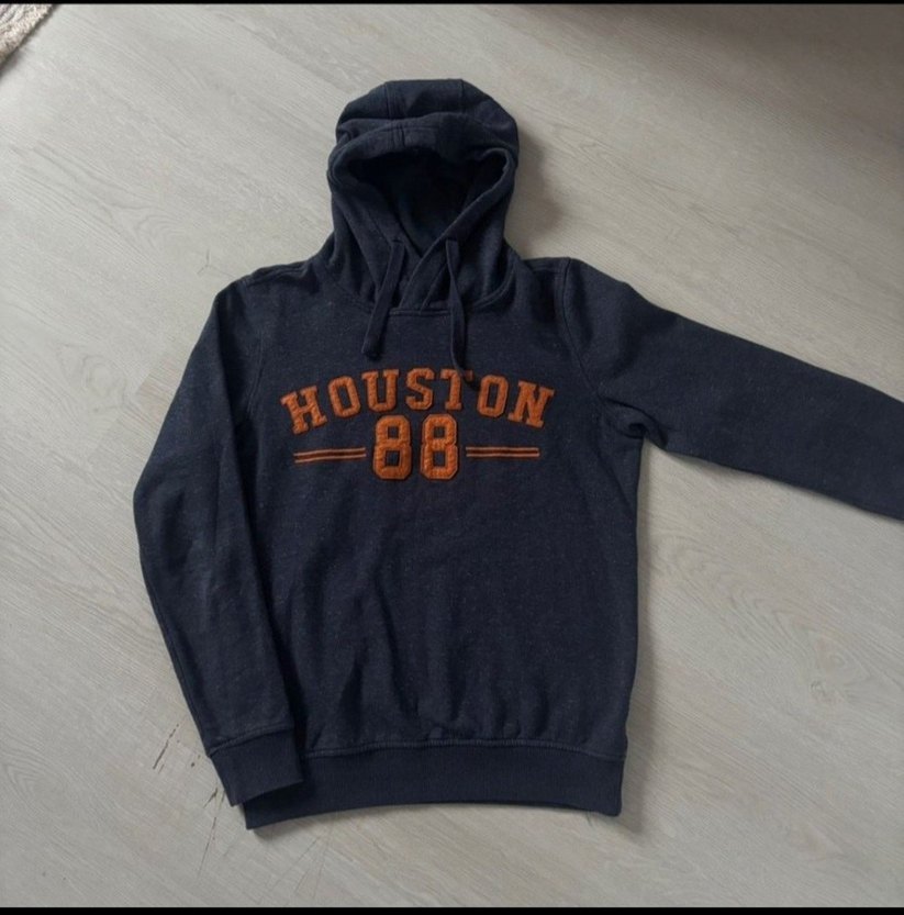 Erkek çocuk için gri kapüşonlu, uzun kollu, yumuşak ve örme dokulu sweatshirt. Önde turuncu "HOUSTON 88" baskısı bulunur, rahat ve trend görünümlü.