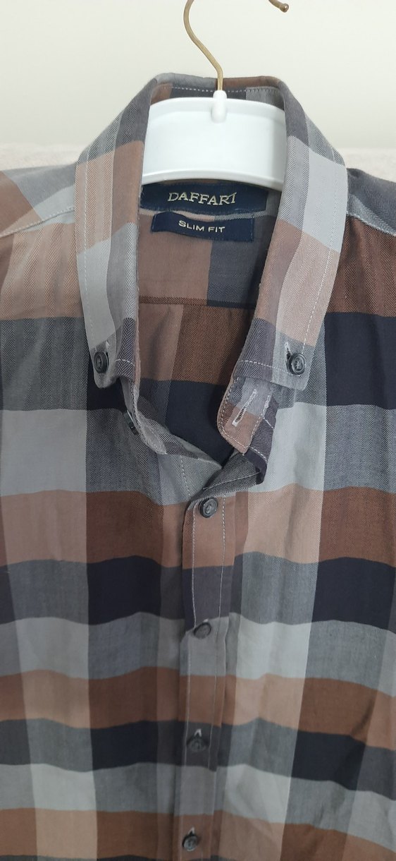 Erkek gömlek, düğmeli ön, kısa kollu ve yakalıdır. Gri ve bej tonlarında kare desenlidir. Sentetik kumaştan, günlük sokak stiline uygundur. DAFFARI SLIM FIT etiketi bulunur.
