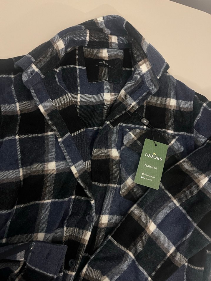 Düğmeli, pamuklu erkek gömleği, gri ve koyu kareli desene sahip. Uzun kollu ve bol kesim, rahat sokak stili için uygundur.