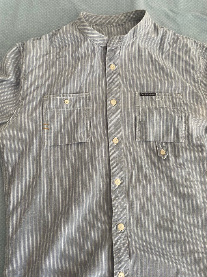 Erkek gömlek, düğmeli ve yakalı, uzun kollu. Nefes alabilen keten kumaştan, regular fit ve ince çizgili desende, gündelik ve sokak stiline uygun.