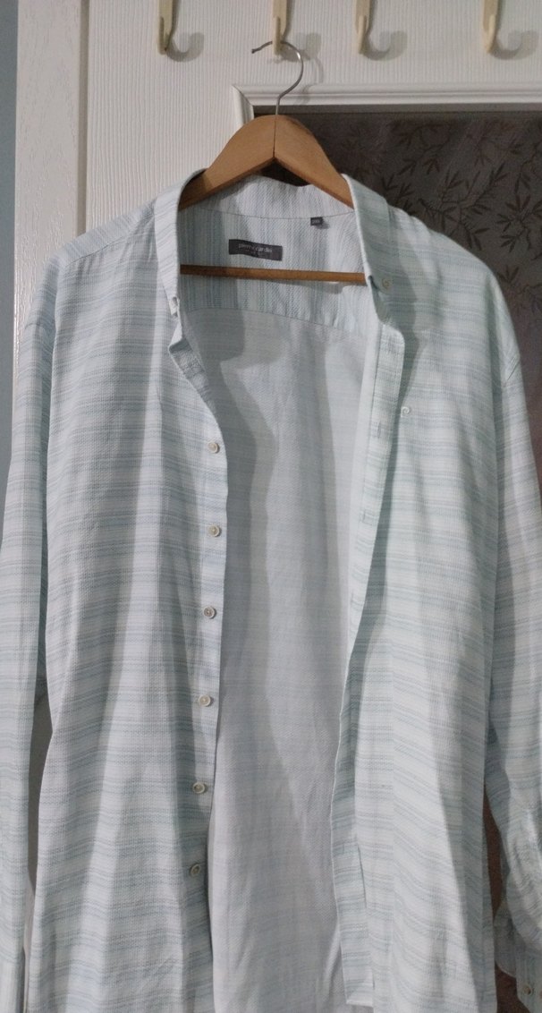 Erkekler için keten kumaştan, uzun kollu ve regular fit kesime sahip, düğmeli, gri-beyaz tonlarında günlük rahat stil gömlek.