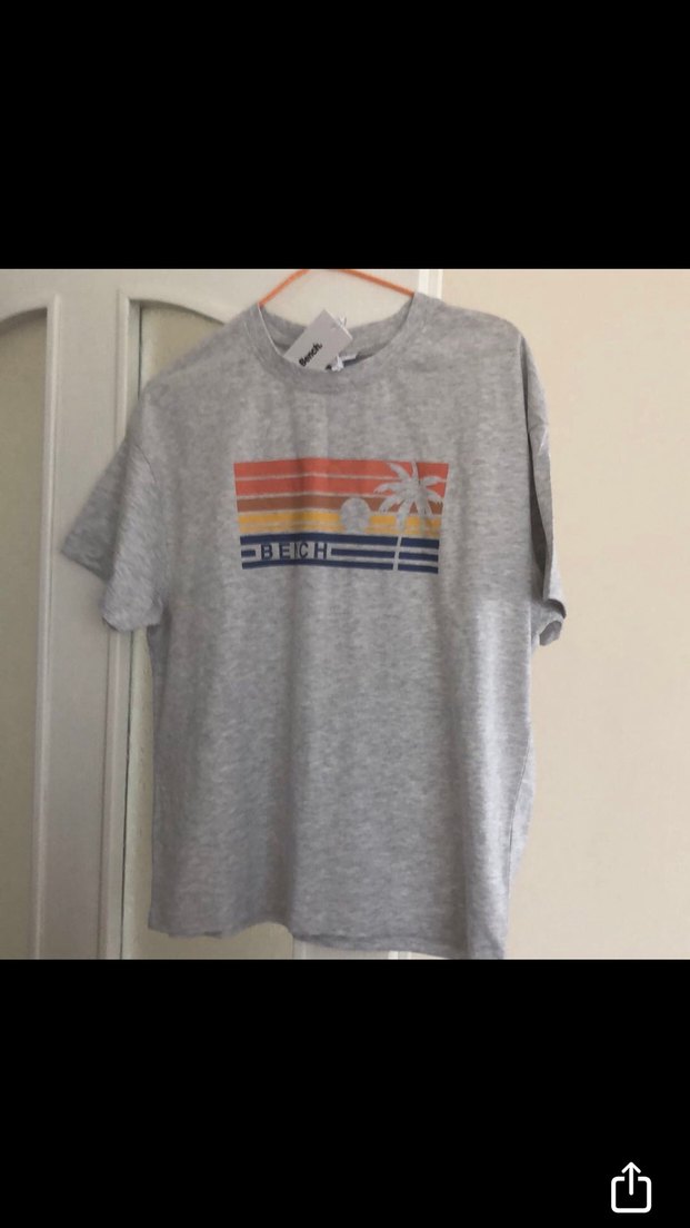 Pamuk kumaştan, kısa kollu, bol kesim gri erkek tişörtü. Üzerinde baskılı plaj teması bulunan rahat bir sokak stili ürünü. Original sıfır etiketli ürün .Omuzdan 66 cm uzunluğunda