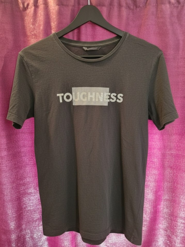 bisiklet yaka ve kısa kollu, gri renkte baskılı 'TOUCHNESS' yazılı dar kesim erkek tişörtü.