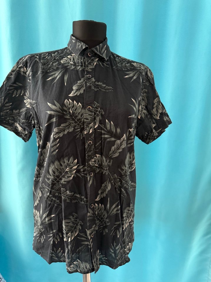 Erkek gömlek, kısa kollu, yakalı ve düğmeli. Sentetik kumaştan, regular fit ve koyu gri tie-dye desenli, günlük rahat kullanıma uygun.