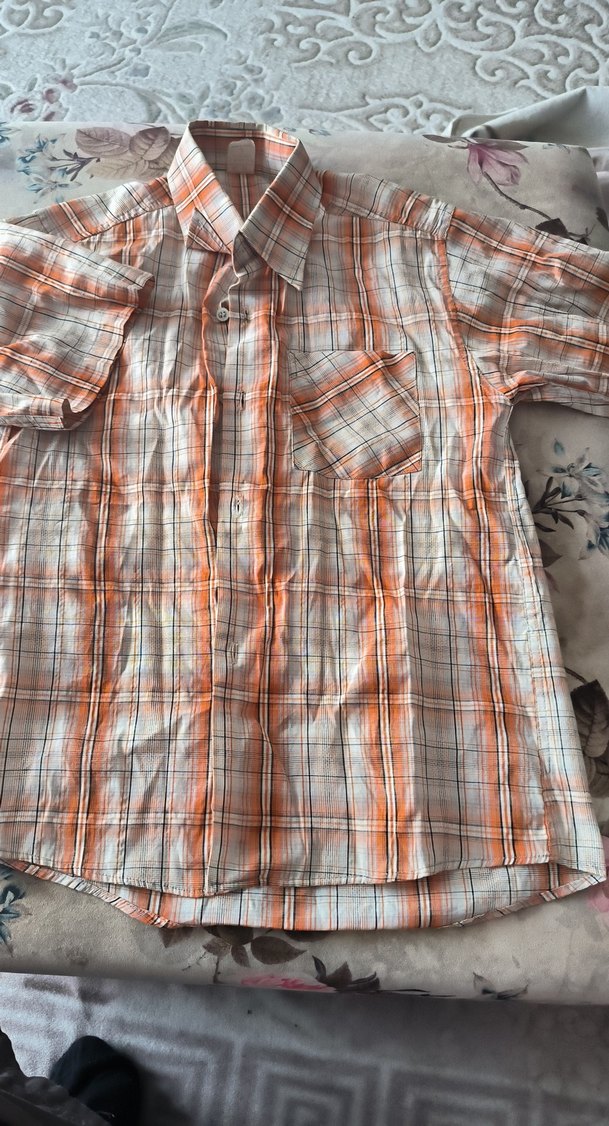 Gri ve turuncu kareli desenli, kısa kollu, düğmeli, yaka yakalı, bol kesim erkek gömleği. Yumuşak dokulu kumaştan, günlük rahat sokak stili için uygun.