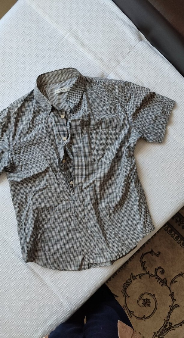 Gri keten kumaştan, düğmeli önden, kısa kollu ve yakalı, bol kesim erkek gömleği.