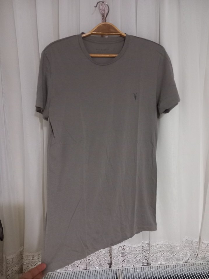 Keten kumaştan erkek gri kısa kollu tişört, yuvarlak yaka ve rahat bol kesime sahiptir. Normal uzunlukta ve asimetrik alt ucu ile günlük sokak stili için uygundur.