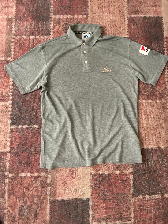 Nefes alabilen keten kumaştan yapılmış, yakalı ve düğmeli, baskılı logolu bol kesim gri erkek polo tişört.