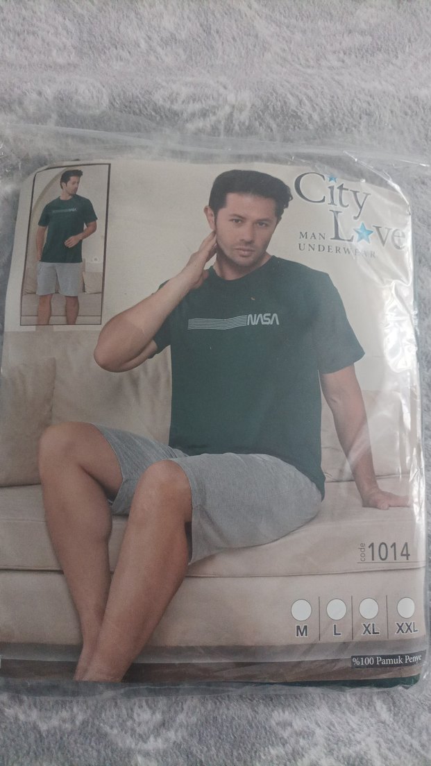 Gri baskılı kısa kollu, yuvarlak yaka üst ve şortlardan oluşan bol kesim erkek pijama takımı. Yumuşak, nefes alabilen pamuk kumaş.
