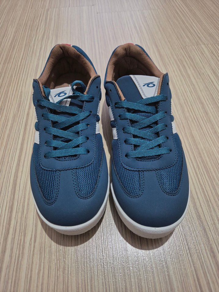 Erkek spor ayakkabılar, dolgu topuk ve bağcıklı yapıya sahip, mavi ve gri tonlarıyla sokak modasına uygun kauçuk tabanlıdır.