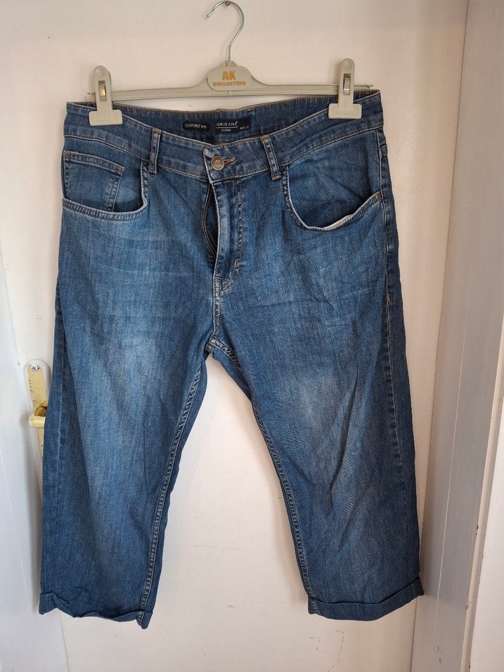 Bu erkek denim pantolon, bol kesim ve midi boyda, tokalı detaya sahip. Gri ve mavi tonlarda, sade desensiz, günlük sokak stili için uygundur.