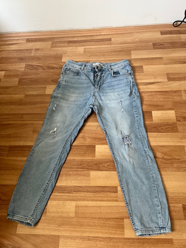 Erkek için bol kesim, gri-mavi renkte denim pantolon. Normal boyda, desen içermeyen, gündelik kullanıma uygun.