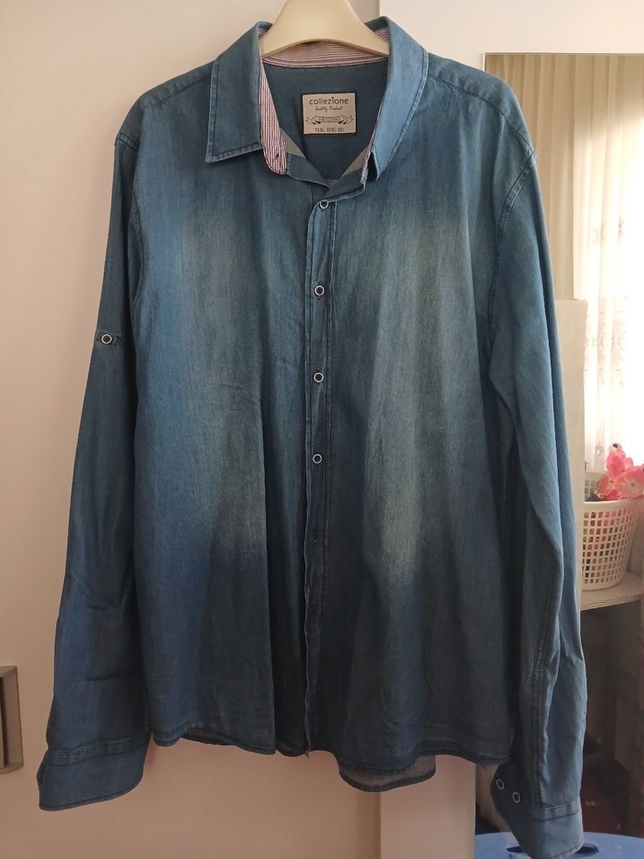 Erkekler için gri-mavi tonlarında, düğmeli, uzun kollu, yakalı ve bol kesim denim gömlek. Günlük kullanıma uygun rahat bir tarz sunar.