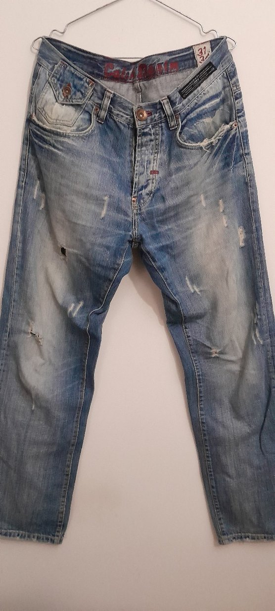 Erkekler için düğmeli, bol kesim, dayanıklı denim kumaştan yapılmış gri-mavi tonlarında pantolon. Günlük kullanıma uygun, normal uzunlukta ve hafif yıpranmış detaylara sahip.