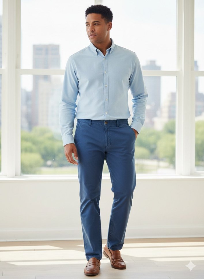 Gri mavi renkte, kemerli, düz desenli, normal boy erkek denim pantolon. Günlük ve açık hava kullanımı için uygundur.