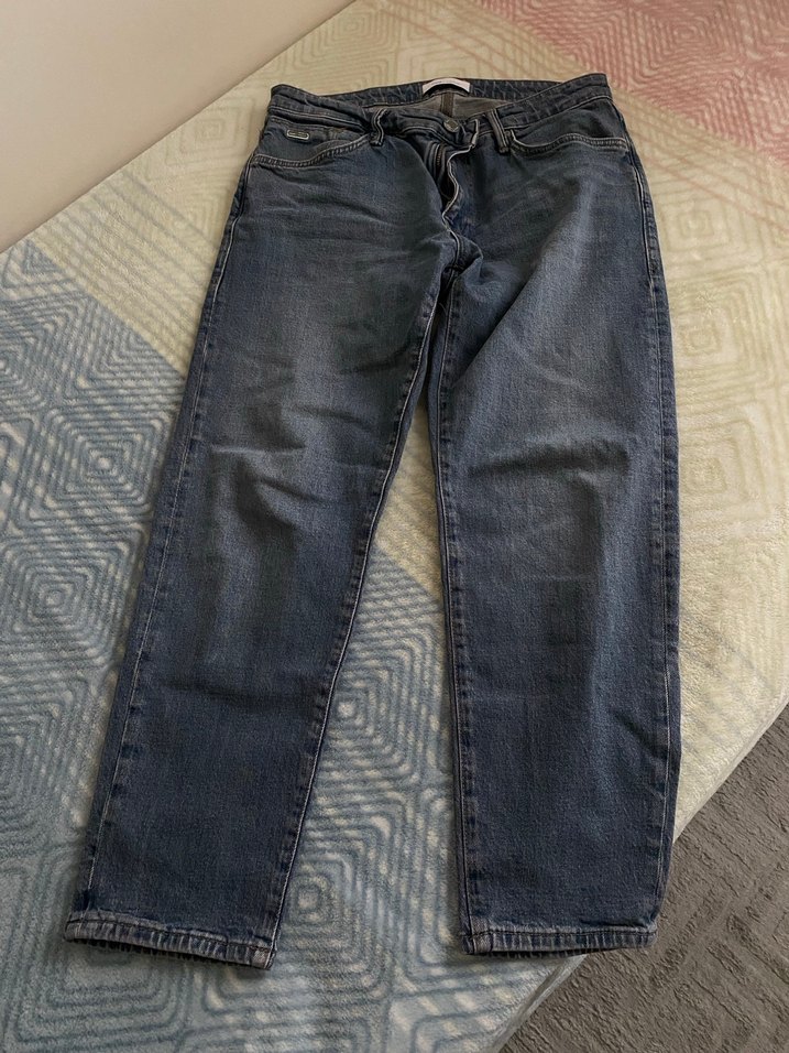 Bol kesim, gri-mavi renkte denim erkek kot pantolon. Normal midi boyda, tokalı detaylıdır. Günlük rahat kullanım için uygundur.
