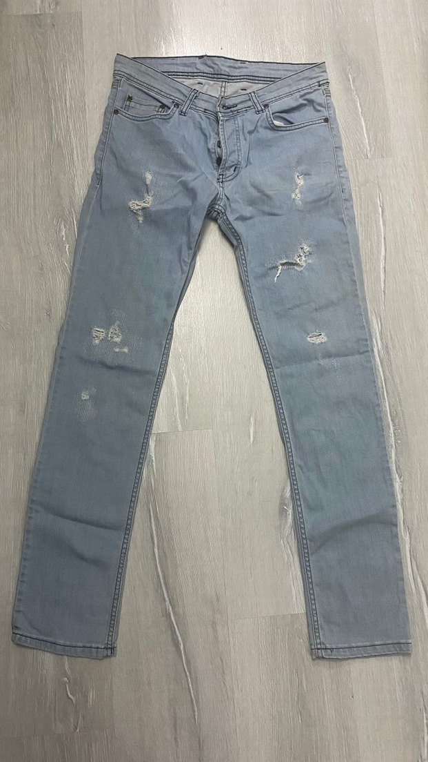 Düzenli kesim ve normal boyda laced tasarımlı erkek jean. Denim kumaştan, gri-mavi renkte, hafif yıpratma detaylı, günlük sokak stili için uygun.