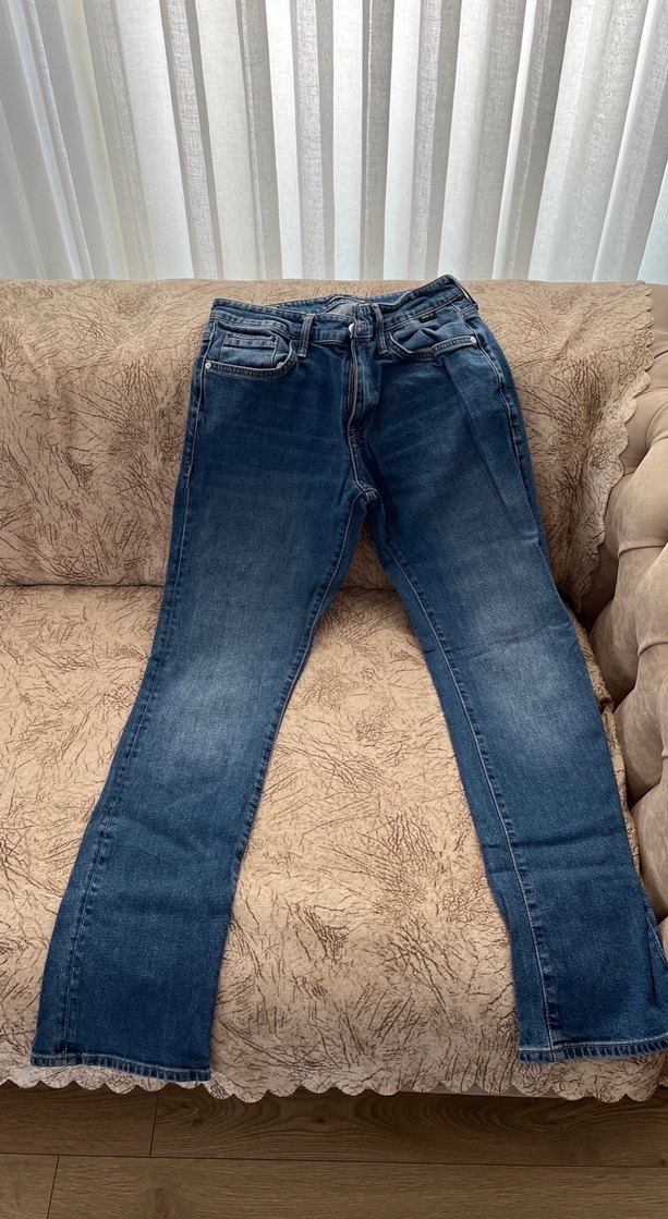 Gri mavi tonlarında, normal boy, kemerli, düz kesim kadın kot pantolon. Günlük kullanıma uygun rahat bir modeldir.